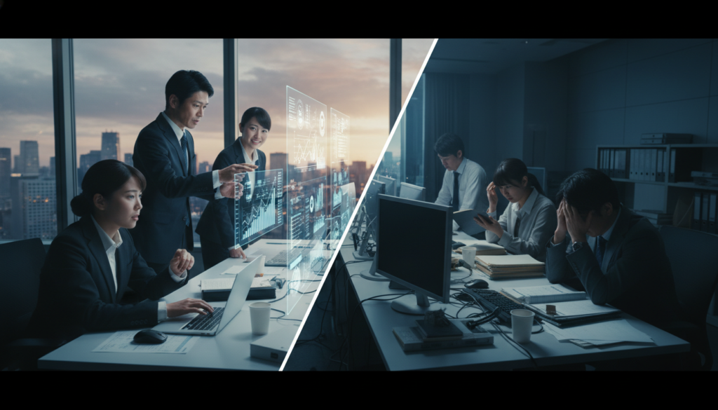 2026年に向けて、ビジネスの世界はかつてないスピードで二極化が進んでいます。それは、単に「AIツールを使っているかどうか」という表面的な違いではありません。根本にあるのは、AIというテクノロジーをどのように認識し、自身の業務プロセスに統合しているかという「スタンスの決定的な差」です。