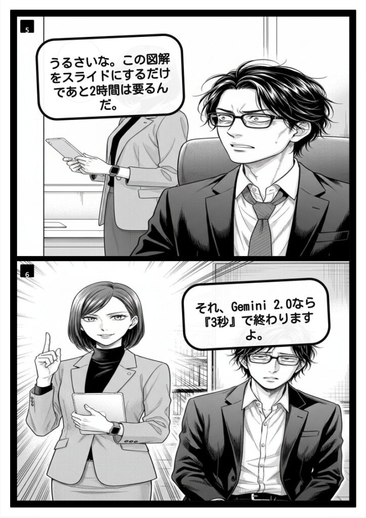 「早さは質を生む」と言われますが、資料作成においては特にその傾向が顕著です。時間をかけるべきは「中身(メッセージ)」の検討であり、「枠組み(スライド作成)」の作業ではありません。Gemini 2.0のスピードは、ビジネスパーソンを単純作業のボトルネックから解放し、本来注力すべき知的生産活動へと時間を再配分するための強力な武器となるのです。