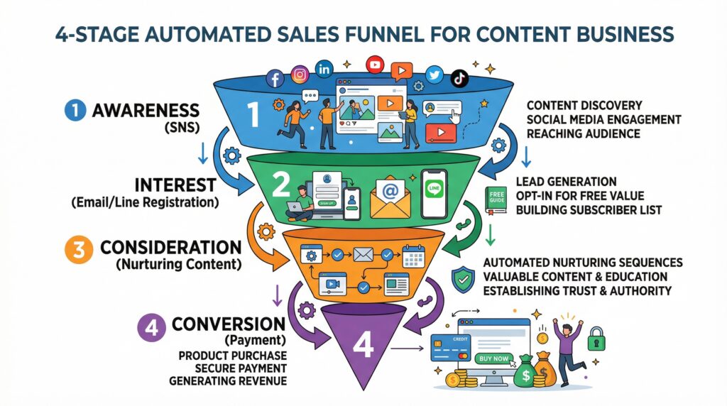 コンテンツビジネスにおける「自動化」とは、ただ単に作業を省くことではありません。顧客が商品を知り、信頼を構築し、購入に至るまでの動線を「無人」で運用する仕組みのことです。