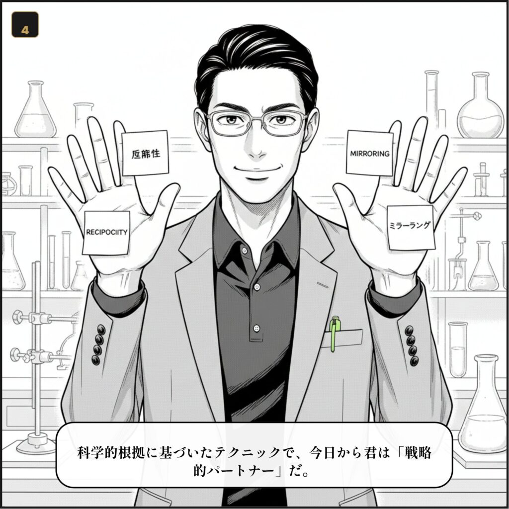 → 心理的劣等感を払拭し、発言力を高めるために不可欠です。 - 科学的アプローチ: 返報性の原理やミラーリングなど、根拠あるテクニックを駆使する。