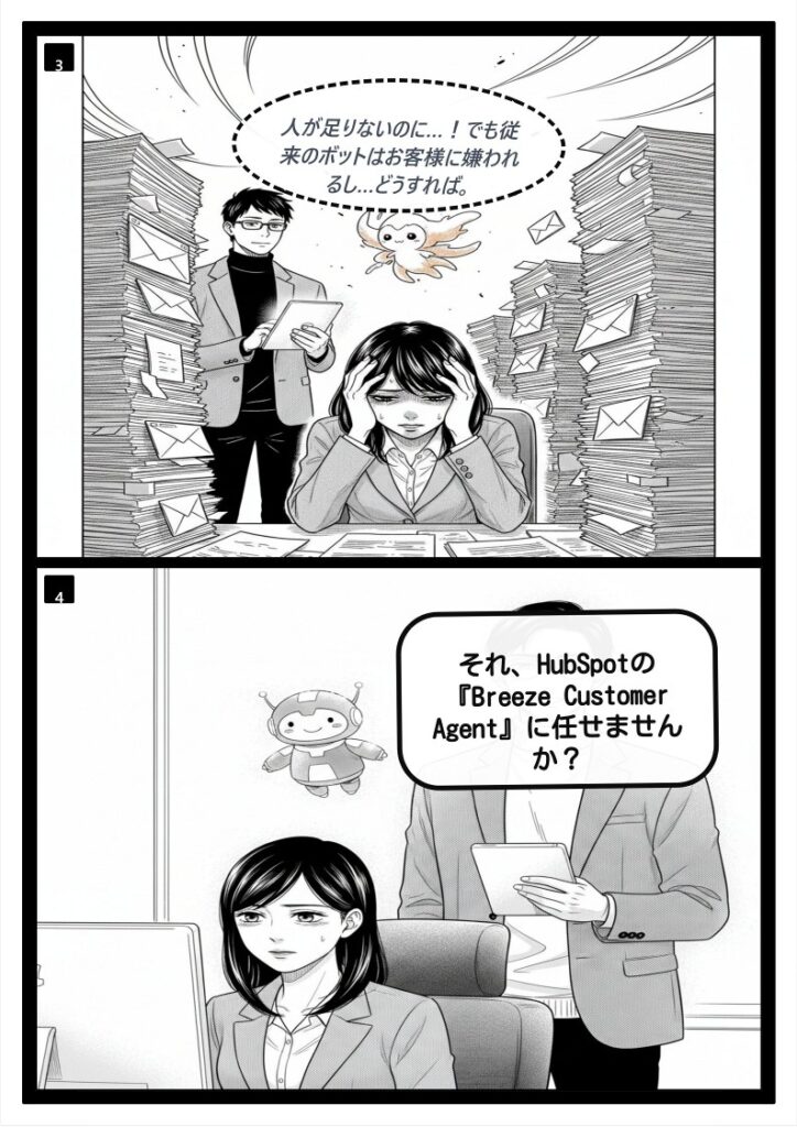 「また同じ質問への返信か…」日々の業務が、単調な問い合わせ対応だけで終わってしまうことに疲弊していませんか?顧客満足度は上げたいけれど、これ以上スタッフに負荷はかけられない。そんなジレンマを抱えるカスタマーサポート責任者にとって、HubSpotの最新AI「Breeze Customer Agent」は、まさに救世主となり得ます。本記事では、単なるチャットボットとは一線を画すこのAIエージェントの導入方法から、実用的な自動化設定、そしてAIと人間が共存する最適なワークフローまでを、専門用語を使わずに徹底解説します。今日からあなたのチームは「守りのサポート」を卒業し、「攻めの顧客対応」へとシフトしましょう。