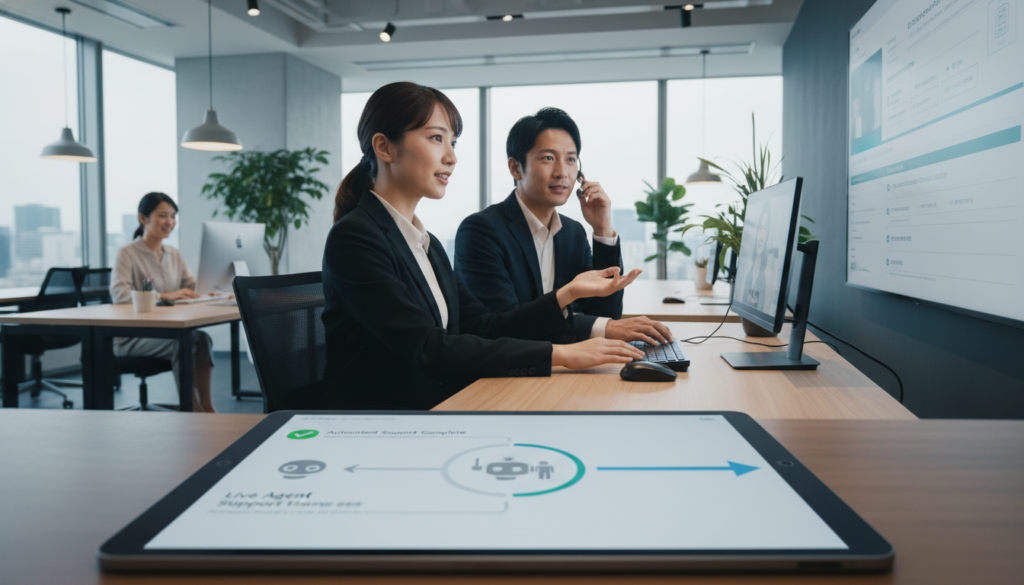 一つのチャットウィンドウの中で、最初はAIが対応し、解決しない場合や特定のアクションが必要な場合に、有人対応(チケット作成やライブチャット)へ切り替える設定です。