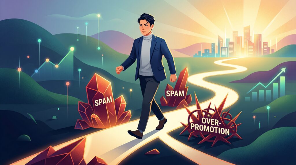 よくある失敗事例として、投稿のすべてがアフィリエイトリンクというケースが挙げられます。SNSにおいて、人は「売り込まれること」を嫌います。信頼を積み上げずに広告だけを流し続けると、ユーザーはフォローを解除し、アカウントの評価も低下します。